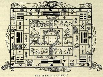 | Keywords: Carus-p48-Mystic-table.jpg en The Mystic Tablet According to Carus' explanation it contains on the shield of a tortoise alluding to the animal that has revealed the Eight Trigrams to Fu Xi and which was in more canonical accounts a dragon horse a chart with the 8 Trigrams the 12 figures of Chinese animal cycle etc The centerpiece is another smaller tortoise the one that revealed the Luoshu magic square to Yu the Great A Tibetan work reproduced first in Waddell The Buddhism of Tibet p 453 and then in Carus Chinese thought p 48 An unknown Tibetan artist original work prior to 1895 Page scan from Carus http //www archive org/stream/chinesethoughtex00carurich page/48/mode/1up Dragon horse Chinese Zodiac Luoshu Ba Gua Turtles in Chinese art PD-old |
