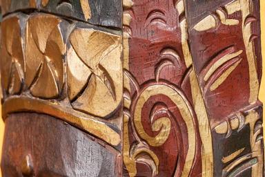 Keywords: carving ornaments temple guardian bali wood painted carved wood carving red green gold art artwork statue head headdress