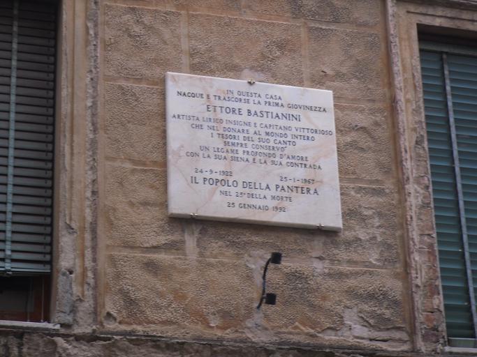 | Keywords: Casa natale Ettore Bastianini.JPG en Plaque affixed by the Contrada of Pantera on the façade of Ettore Bastianini's birth house in via Paolo Mascagni in Siena on the 25th anniversary of his death The plaque says «In this house was born and spent his childhood Ettore Bastinini renowed lyrical artist and 'victorious captain who in donating to the entire world the treausers of his singing forever kept a deep love tie with his Siena and his Contrada» it Targa apposta sulla facciata della casa natale di Ettore Bastianini in via Paolo Mascagni a Siena da parte della Contrada della Pantera nel 25° anniversario della morte del celebre baritono che ne fu capitano vittorioso own PMM82 2010-03-20 Plaques in Siena Ettore Bastianini Plaques installed in 1992 Here-was-born plaques in Siena Here-lived plaques in Siena Plaques to people in Italy 1922 here-was-born plaques Paolo Mascagni |