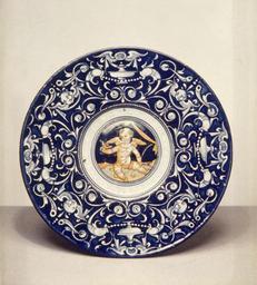 | Keywords: Casa Pirota Workshop - Plate with Cupid - Walters 481339.jpg Like the similar plate showing Cupid climbing a tree this depiction of Cupid wrapped with twine and holding a palm and a flower likely represents an allegory or a popular saying that is no longer known Cupid the god of love and the son of Venus was often depicted as a playful and mischievous child The pattern in the border of this berettino plate is characteristic of maiolica painted in Faenza during the 1510s-30s It derives ultimately from the fanciful scenes that decorated the walls of Roman palaces excavated in Rome Since these underground excavations formed grottos the style was called grotesque Limoges enamel ware of the 16th century was also influenced by this style ca 1525 1540 Renaissance earthenware with tin glaze maiolica cm 24 4 w accession number 48 1339 32461 Henry Walters city Baltimore Walters Art Museum Henry Walters Acquired by Henry Walters 1905 place of origin Faenza Italy Walters Art Museum license Italian Renaissance maiolica in the Walters Art Museum Media from the Walters Art Museum no creator template Faenza maiolica Cupid on plates Maiolica in the United States |