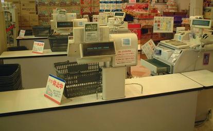 Keywords: Cash register Japan2007.JPG Cash register in Japan Own 2007/10/6 Kanesue Cash registers in Japan Supermarket checkouts Interiors of supermarkets in Japan Kanji signs English and Japanese language signs in Japan