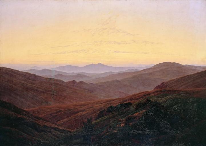 | Keywords: Caspar David Friedrich - The Riesengebirge - WGA8285.jpg Artwork Creator Caspar David Friedrich between 1830 1835 Oil on canvas size cm 73 5 102 5 Institution Alte Nationalgalerie 3 06 accession number A I 1079 02531383 object history 1909 Ankauf von Frau Elsa von Corswandt Berlin vorher Crummin bei Wolgast ; bereits 1906-09 als Leihgabe des Schlesischen Kunstvereins in der NG credit line 1 WGA link 8285 http //www wga hu/art/f/friedric/4/409fried jpg http //www wga hu/html/f/friedric/4/409fried html <br/>2 http //gallerix ru/storeroom/862540582/N/869081907/ gallerix ru PD-old-100 painting landscape German 1801-1850 DEFAULTSORT Caspar David Friedrich Riesengbirge 1830s paintings by Caspar David Friedrich 1830 Erinnerungen an das Riesengebirge Paintings by Caspar David Friedrich in the Nationalgalerie 1830s paintings 19th-century paintings WGA form painting WGA type landscape WGA School German WGA time period 1801-1850 Krkonoše in art |