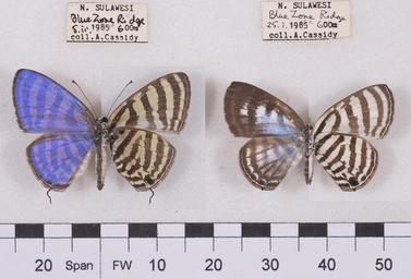 Keywords: CastaliusFasciatusAdorabilisMFUpUnAC1.jpg en Castalius fasciatus adorabilis male female set specimens Northern Sulawesi Alan Cassidy photo own Accassidy 2010-02-21 Castalius fasciatus Butterflies of Project Wallace