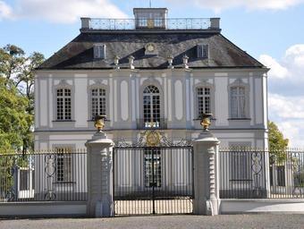Keywords: castle falkenlust hunting lodge brühl architecture construction clemens august prince hunting baroque rococo white grey fence grid light goal build germany rheinland facade