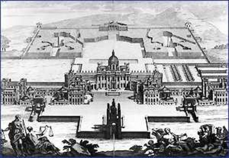 | Keywords: Castle Howard - VB birdseye.jpg A birds-eye view of Vanbrugh's plans for Castle Howard in England from Colen Campbell's Vitruvius Britannicus The central block and the wings to the left were built as proposed The wing to the right of the central block was built a few decades later in a different form The courtyard next to it and the wing furthest to the right which were the stables were not built at all A detached stable block was built a few hundred yards from the house instead The grand entrance gateways shown were not built Uploaded by en User Gillian Tipson Castle Howard Vitruvius Britannicus PD-old |