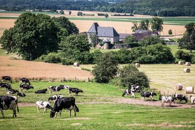 Keywords: castle reiterhof fields burg holzheim lowland castle cows pasture agriculture hay bales straw bales langerwehe germany
