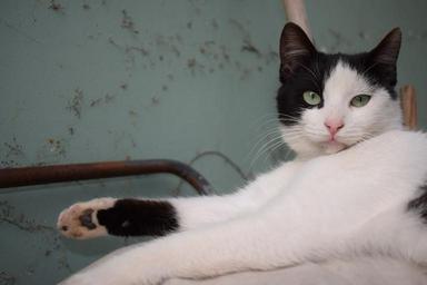 Keywords: cat black white green eyes pet animal green cute kitten paw surprised