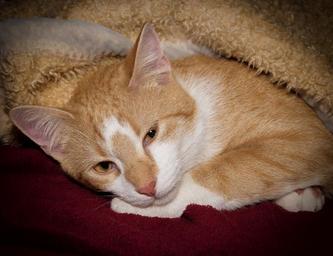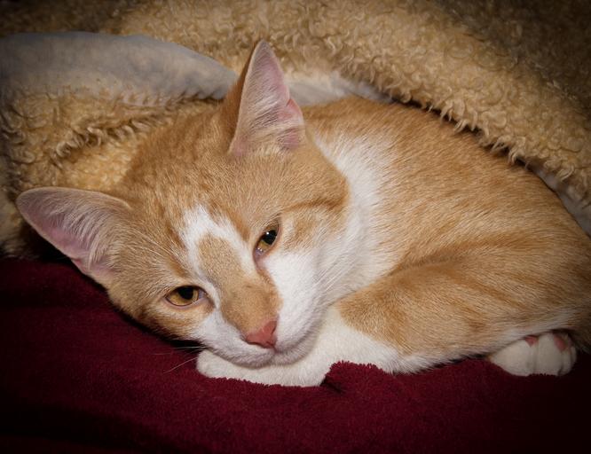 Keywords: cat concerns tired blanket rest red white