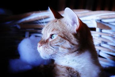 Keywords: cat dark rainy day ears fur basket calm relaxed light camera