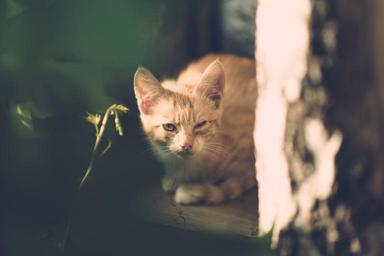 Keywords: cat eye injury one eye village illness vintage wooden outdoor animal pet cute young little unhappy small family domestic red fur portrait nature garden poor