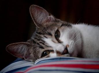 Keywords: cat face portrait pet domestic feline cute eyes head close up looking resting kitty furry indoors book bored tabby