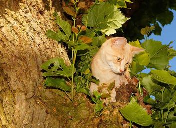 Keywords: cat female head climb tree catching birds cheeky furry brown