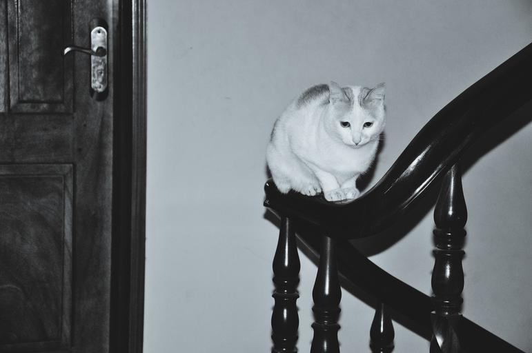 Keywords: cat handrail stairs elevator funny black and white