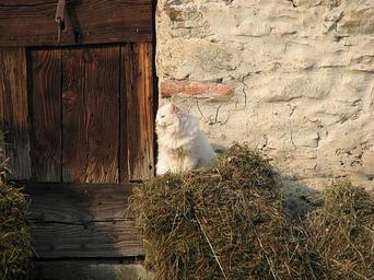 Keywords: cat kitten farm hay feline kitty furry pet animal domestic mammal young adorable outdoors fur