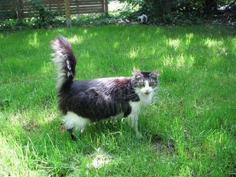 Keywords: cat pet garden green attention fur dear out cat portrait black and white meadow norwegian forest cat curious spring rush active