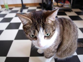 | Keywords: cat pet mieze cat face head young cat domestic cat adidas animal squared black white macro photo macro black and white snout neck datailaufnahme close b w floor unförig big head ears whiskers wide angle artwork art cute skeptical curious interested vigilant cheeky |