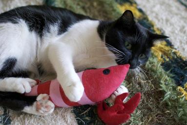 Keywords: cat play plush kick animal one animal black and white cute curiosity