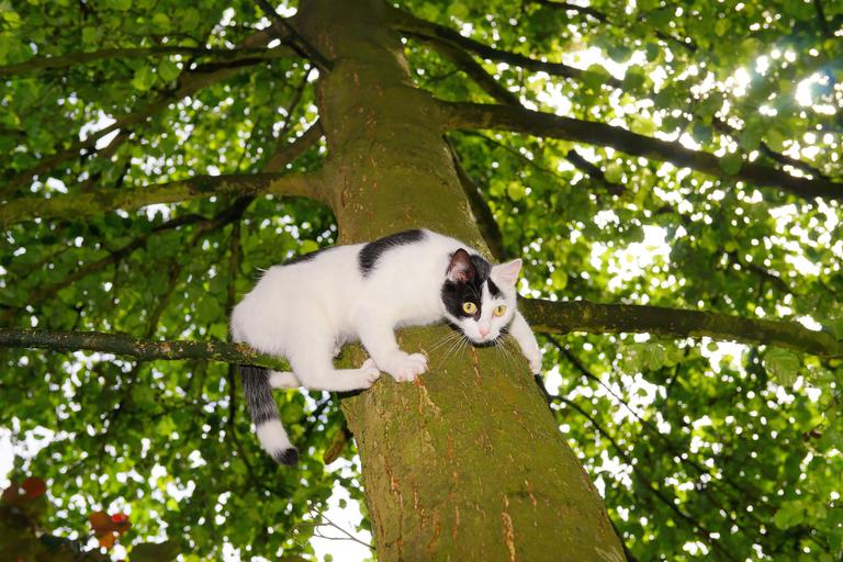 Keywords: cat tree climb young cat pet nature cat in the tree domestic cat in the free curious playful animal animal world black and white fur adidas