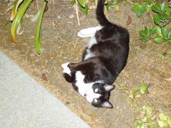 Keywords: Cat with glowing eyes.JPG Cat at night with light reflecting off its retina Note the intensity of the reflection due to the camera flash 2005-08-01 own assumed Imageman~commonswiki Tuxedo patterned black and white cats Eyeshine cats