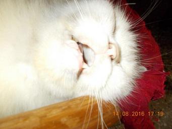Keywords: Cat with missing canine..JPG en 9 year old Traditional Persia Original long Hair cat Matahari with a bed set of teeth Her one canine is missing as also a few other teeth own Rudolph A furtado Sunday 14-8-2016 Cat teeth Cc-zero