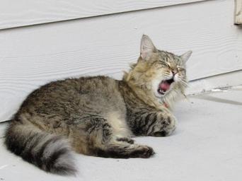 Keywords: cat yawning feline resting cute reclining domestic curious animal pet fur long hair portrait adorable outdoors nature