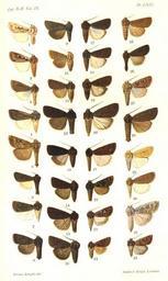 Keywords: CATALOGUE-BM-LXII.jpg en PLATE LXII 1 Euxoa biclavis m Vol IV p 213 Arizona H10899 Protogygia biclavis Grt 1879 2 E hollemani m p 213 California H10820 Euxoa E hollemani Grt 1874 3 E collocata f p 214 Colorado H10768 Euxoa E atristrigata Sm 1890 4 E nevada m p 214 California H10769 Euxoa E nevadaa Sm 1900 5 E submolesta m p 215 Tibet 6 E flaviscapula m p 216 New Mexico H10805 Euxoa E tessellata Harr 1841 7 E candida m p 216 Montana H10766 Euxoa E misturata Sm 1890 8 E sponsa f p 217 Washington H10785 Euxoa E infausta Wlk 1865 9 E loya f p 217 California H10787 Euxoa E loya Sm 1900 10 E bicollaris m p 218 California H10788 Euxoa E bicollaris Grt 1878 11 E excogita f p 218 Colorado H10787 Euxoa E loya Sm 1900 a excogita Sm 1900 n stat 12 E punctigera m p 219 Vancouver H10787 Euxoa E punctigera Wlk 1865 13 E perpolita f p 219 Massachusetts H10865 E Orosagrotis perpolitaa Morr 1900 14 E finis f p 219 Montana H10805 Euxoa E tessellata Harr 1841 15 E perfusca m p 220 Washington H10786 Euxoa E satis Harv 1876 16 E fumalis m p 220 New York H10781 Euxoa E fumalis Grt 1873 17 E velleripennis m p 220 New York H10803 Euxoa E velleripennis Grt 1874 18 E atomaris m p 22l Colorado H10726 E Pleonectopoda atomaris Sm 1890 19 E atrofusca m p 222 Washington H10805 Euxoa E tessellata Harr 1841 20 E stigmatilis f p 222 Arizona H10805 Euxoa E stigmatalis Sm 1900 21 E gagates m p 223 Massachusetts H10738 Euxoa E mimallonis Grt 1873 22 E falclandica m p 224 Falkland Is 23 E misturata f p 224 Colorado H10766 Euxoa E misturata Sm 1890 24 E moerens m p 224 Colorado H10847 Euxoa E moerens Grt 1883 25 E robiginosa f p 225 Syria 26 E exculta m p 225 Br Columbia H10865 E Orosagrotis perpolita Morr 1876 27 E cursoriodes m p 226 Syria 28 E cremioides m p 227 Hawaii 29 E citricolor m p 227 Colorado H10805 Euxoa E citricolor Grt 1880 30 E viguraea m p 661 Mongolia 31 E remota f p 228 California H10805 Euxoa E tessellata Harr 1841 32 E detersa m p 229 Canada H10838 Euxoa E detersa Wlk 1856 CATALOGUE OF THE NOCTUIDAE IN THE COLLECTION OF THE BRITISH MUSEUM Sir GEORGE F HAMPSON Bart 1903-1913 PD-old Catalogue of Lepidoptera Phalaenae in the British Museum Vol 4