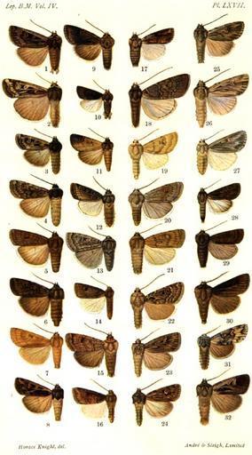 Keywords: CATALOGUE-BM-LXVII.jpg en PLATE LXVII 1 Euxoa oberthuri m Vol IV p 310 China 2 E auxiliaris m p 311 Texas H10731 E Chorizagrotis auxiliaris Grt 1873 3 E sorella f p 312 Mexico 4 E balinitis f p 312 Colorado H 5 E inconcinna m p 314 Texas H10732 E Chorizagrotis inconcinna Harv 1875 6 E intracta m p 315 Punjab 7 E xanthiodes m p 315 Kashmir 8 E flavicollis m p 318 Canada H10864 E E flavicollis Sm 1888 9 E proclivis f p 320 Arizona H10871 Loxagrotis proclivis Sm 1888 10 E fumicolor m p 321 Mashonaland 11 E apicalis f p 321 Arizona H10869 Loxagrotis grotei Franc Todd 1983 12 E cleiducha m p 322 Ecuador 13 E abnormis m p 323 California H10788 E E bicollaris Grt 1878 14 E pronycta m p 324 Mashonaland 15 E reclusa m p 324 Australia 16 E indigna m p 324 Natal 17 E epipyra m p 325 Mashonaland 18 E hirtipalpis m p 326 Colombia 19 E amoena m p 328 Armenia 20 E peperida m p 329 Kashmir 21 E opisoleuca m p 329 Persia 22 E exacta m p 330 W Turkestan 23 E turbans m p 331 W Turkestan 24 E celsicola m p 332 Syria 25 E improba m p 333 W Turkestan 26 E lagena f p 334 Nevada H10892 Protogygia lagena Grt 1875 27 E albalis f p 335 Nevada H9576 Rhizagrotis albalis Grt 1878 28 E pygmaea m p 336 W Turkestan 29 E nyctina m p 336 Kumaon 30 Feltia venerabilis m p 338 Canada H10651 Agrotis venerabilis Wlk 1857 31 F milleri m p 339 California H10898 Protogygia milleri Grt 1876 32 F pectinicornis m p 340 Texas H10677 Sm 1890 CATALOGUE OF THE NOCTUIDAE IN THE COLLECTION OF THE BRITISH MUSEUM Sir GEORGE F HAMPSON Bart 1903-1913 PD-old Catalogue of Lepidoptera Phalaenae in the British Museum Vol 4 |