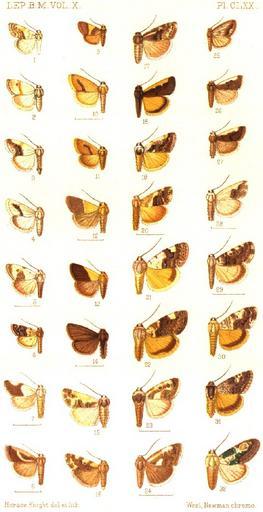 | Keywords: CATALOGUE-BM-PLATE CLXX.jpg en PLATE CLXX 1 Tarachidia neomexicana m Vol X p 695 Texas H9090 T candefacta Hbn 1831 2 T virginalis f p 696 Texas H9088 Grt 1881 3 T binocula m p 696 Texas H9089 Grt 1875 4 T tenuescens f p 696 Florida H9088 T virginalis Grt 1881 5 T huita f p 697 Arizona H9092 Sm 1903 6 T semibrunnea m p 697 Paraguay 7 T cuta m p 698 New Mexico H9094 Sm 1905 8 T alata m p 698 Arizona H9099 Sm 1905 9 T jativa m p 698 Arizona H 10 T perita m p 699 Arizona H9087 T venustula Wlk 1865 11 T venustula f p 699 Arizona H9087 Wlk 1865 12 T clausula m p 700 Arizona H9086 Grt 1883 13 T semiflava m p 700 Texas H9085 Gn 1852 14 T fumata m p 701 Nevada H9101 T tortricina Zell 1872 a fumata Sm 1905 15 Conacontia huachuca m p 702 Arizona H9113 Therasea huachuca Sm 1903 16 C orba f p 704 Arizona H9114 Therasea orba Sm 1903 17 C angustipennis f p 704 Texas H9111 Therasea augustipennis Grt 1875 18 Cardiosace bidentata m p 706 Mashonaland 19 C parilis m p 707 Cape Colony 20 C olivescens m p 708 Transvaal 21 C triphaenoides m p 708 Natal 22 C triphaenoides f p 708 Natal 23 C natalis m p 709 Natal 24 C natalis f p 709 Natal 25 Hoplotarache sublota m p 712 Madagascar 26 H semialba m p 713 Br E Africa 27 H costalis m p 714 Madras 28 H carachiensis m p 714 Sind 29 H nubila m p 715 Br E Africa 30 H dispar m p 716 Basutoland CATALOGUE OF THE NOCTUIDAE IN THE COLLECTION OF THE BRITISH MUSEUM Sir GEORGE F HAMPSON Bart 1903-1913 PD-old Catalogue of Lepidoptera Phalaenae in the British Museum Vol 10 |