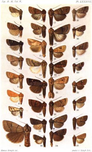 | Keywords: CATALOGUE-BM-PLATE LXXXVII.jpg en PLATE LXXXVII 1 Eriopypa ochrota m Vol V p 300 Mexico 2 E planalis m p 301 New Mexico H10595 Hexorthodes planalis Grt 1883 3 E agrotiformis f p 302 Colorado H10596 Hexorthodes agrotiformis Grt 1881 4 E perforata m p 302 Arizona H10595 Protorthodes perforata Grt 1883 5 E culea m p 304 Florida H10567 Ulolonche culea Gn 1852 6 E consopita f p 305 Arizona H10568 Ulolonche consopita Grt 1881 7 E diplogramma m p 305 Mexico 8 E curvata m p 308 Corea 9 E secedens f p 312 Brazil 10 E excavata f p 312 Brazil 11 E flavigera m p 315 Costa Rica 12 E carneigera m p 317 Brazil 13 E orbica m p 318 Mexico 14 E lanaris m p 319 Mexico 15 E moderata f p 319 Colombia 16 E jamaicensis m p 321 Jamaica 17 E niveipuncta f p 325 Panama 18 E melanosticta m p 326 Paraguay 19 E nigripars m p 327 Costa Rica 20 E janeira m p 329 Brazil 21 E punctula m p 329 Brazil 22 E glaucistis m p 331 Brazil 23 E azucara f p 331 Brazil 24 E mesostrigata m p 333 Guatemala 25 E intractata m p 335 U S A H10502 Himella intractata Morr 1874 26 E goniostigma m p 335 Mexico 27 E violascens f p 340 Mexico 28 E ropilla m p 34l Ecuador 29 E irrorata m p 341 Washington H10582 Pseudorthodes irrorata Sm 1888 30 E virgula m p 342 New Mexico H10584 Pseudorthodes virgula Grt 1883 31 E pyropis m p 342 Costa Rica 32 E iole m p 343 Guatemala CATALOGUE OF THE NOCTUIDAE IN THE COLLECTION OF THE BRITISH MUSEUM Sir GEORGE F HAMPSON Bart 1903-1913 PD-old Catalogue of Lepidoptera Phalaenae in the British Museum Vol 4 |