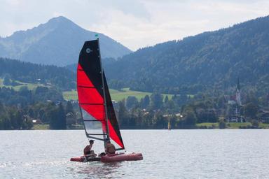 Keywords: catamaran ship boot sail red black water lake mountains forest tegernsee upper bavaria holiday recovery summer sun travel nature rest landscape
