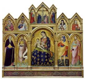 | Keywords: Catarino Veneziano - Madonna and Child, the Crucifixion, and Saints - Walters 37635.jpg Walters Art Museum artwork Creator Catarino Veneziano Madonna and Child Crucifixion and Painting during a period when artists no longer worked as anonymous craftsmen Catarino signed this altarpiece prominently Catarino from Venice painted this Juxtaposed with the donor's coat of arms lower center now missing this signature aligns him with the patron who kneels at Mary's feet The patron shows his devotion through his commission the artist through his skill The glowing face on Mary's dress associates her with the woman clothed with the sun Revelation 12 1 of the Bible Both Mary and the Woman were understood to be symbols of the Christian Church Sts Anthony Abbot and John the Baptist stand to Mary's right To her left are Sts Christopher and James the Great St Lucy with her lamp and St Catherine of Alexandria with her wheel flank the Crucifixion with Mary and John at the top The half-length figures from left to right are Sts Ursula Bartholomew Clare and Barbara Ursula and Barbara have been mislabeled but may be recognized by their attributes-Ursula holds an arrow and Barbara holds a monstrance a container used to display the consecrated wafer For more information on this polyptych please see Zeri catalogue number 34 pp 56-58 ca 1380 1389 Medieval tempera gold panel H with frame and original base 69 1/2 x W 73 3/16 in 176 5 x 185 9 cm ; Framed cm 176 5 186 1 12 1 ; Panel with Madonna Child and donor including reserved margins cm 117 5 62 5 ; Panels with SS Anthony Abbot John the Baptist Christopher James the Great each approx cm 102 5 29 5 ; Panel with Crucifixion cm 42 31 ; Panel with St Catherine cm 39 16 ; Panel with St Lucy cm 38 2 16 ; Panel with SS Ursula and Bartholomew approx cm 32 59 ; Panel with SS Clare and Barbara approx cm 30 5 58 4 ; Min original panel D cm 1 3 ; Max original panel D cm 2 5 accession number 37 635 6083 Unknown family Osimo date of acquisition unknown by commission Count Giovanni Orsi Ancona prior to 1855 mode of acquisition unknown Piccoli Venice date and mode of acquisition unknown Henry Walters Baltimore 1908-1909 mode of acquisition unknown Walters Art Museum Henry Walters Acquired by Henry Walters 1908-1909 Transcription In upper tier panels from left to right S BARBARA; S BA TOLI ; S LVCIA; I N R I ; S CATARINA; S CHLARA; MAR ; Transcription In main row in scroll held by John the Baptist ECCE / AGN / V DE / I ECC / E QVI / TOLI / PECA / TA M / VNDI; Transcription Signed in center of base CHATARI / NVS DE / VENECII / PINXIT The International Style The Arts in Europe Around 1400 The Walters Art Gallery Baltimore 1962 place of origin Venice Italy Walters Art Museum license 3D Medieval art in the Walters Art Museum Catarino Veneziano Paintings in the Walters Art Museum Madonna and Child |