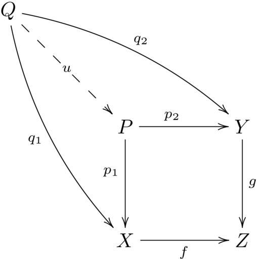Keywords: Categorical pullback (expanded).svg en A commutative diagram expressing the universal property of a categorical pullback Own Ryan Reich 2009-01-14 File CategoricalPullback-02 png LaTeX source <pre> \documentclass amsart \usepackage amsmath amssymb nopageno \usepackageall xy \begin document \begin equation \xymatrix C+2em R+2em Q \ar /_10pt/ddr_ q_1 \ar / 10pt/drr q_2 \ar --> dr +<3pt 3pt> \scriptstyle u \\ P \ard_ 0 4 p_1 \arr 0 4 p_2 Y \ard g \\ X \arr_ f Z \end equation \end document </pre> Commutative diagrams Images with LaTeX source code