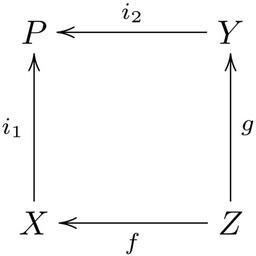 Keywords: Categorical pushout.svg en A commutative diagram depicting the categorical pushout of two maps Own Ryan Reich 2009-01-14 File CategoricalPushout-01 png LaTeX source <pre> \documentclass amsart \usepackage amsmath amssymb nopageno \usepackageall xy \begin document \begin equation \xymatrix C+2em R+2em P \ar <- d_ i_1 \ar <- r i_2 Y \ar <- d g \\ X \ar <- r_ f Z \end equation \end document </pre> Commutative squares Images with LaTeX source code