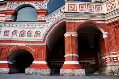 Keywords: cathedral church st basil the blessed red square detail intricate pillars arches red and white architecture