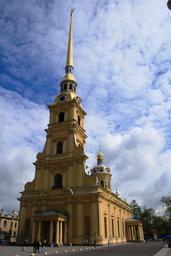 Keywords: cathedral church architecture yellow ochre building religion russian orthodox tower with spire windows arches sky scattering clouds