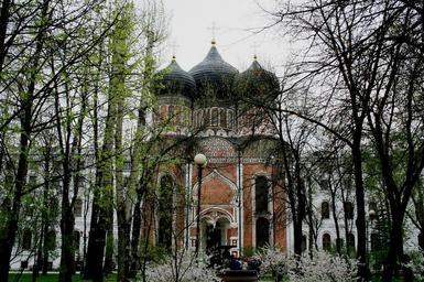 Keywords: cathedral church building red and white architecture religion russian orthodox onion domes black stately tall trees sky spring blossoms