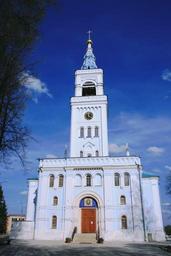 Keywords: cathedral church building white blue tower tall spire windows arches golden crosses blue sky russian orthodox religion