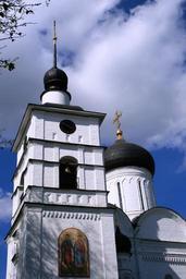 Keywords: cathedral russian church orthodox building white architecture domes black tower sky clouds
