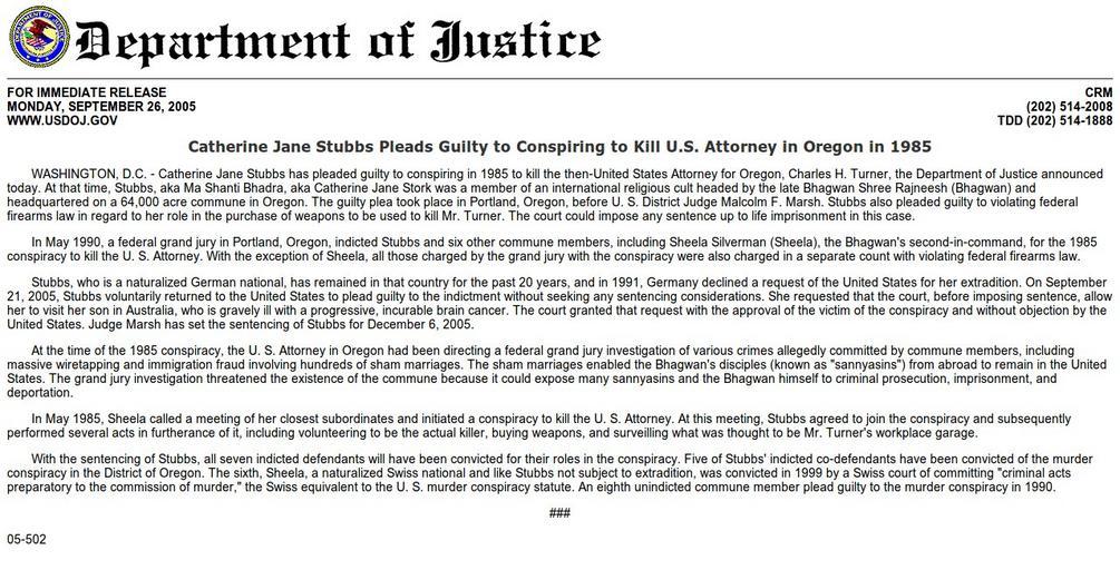 | Keywords: Catherine Jane Stubbs Pleads Guilty to Conspiring to Kill U.S. Attorney in Oregon in 1985.jpg Catherine Jane Stubbs Pleads Guilty to Conspiring to Kill U S Attorney in Oregon in 1985 WASHINGTON D C - Catherine Jane Stubbs has pleaded guilty to conspiring in 1985 to kill the then-United States Attorney for Oregon Charles H Turner the Department of Justice announced today At that time Stubbs aka Ma Shanti Bhadra aka Catherine Jane Stork was a member of an international religious cult headed by the late Bhagwan Shree Rajneesh Bhagwan and headquartered on a 64 000 acre commune in Oregon The guilty plea took place in Portland Oregon before U S District Judge Malcolm F Marsh Stubbs also pleaded guilty to violating federal firearms law in regard to her role in the purchase of weapons to be used to kill Mr Turner The court could impose any sentence up to life imprisonment in this case In May 1990 a federal grand jury in Portland Oregon indicted Stubbs and six other commune members including Sheela Silverman Sheela the Bhagwan's second-in-command for the 1985 conspiracy to kill the U S Attorney With the exception of Sheela all those charged by the grand jury with the conspiracy were also charged in a separate count with violating federal firearms law Stubbs who is a naturalized German national has remained in that country for the past 20 years and in 1991 Germany declined a request of the United States for her extradition On September 21 2005 Stubbs voluntarily returned to the United States to plead guilty to the indictment without seeking any sentencing considerations She requested that the court before imposing sentence allow her to visit her son in Australia who is gravely ill with a progressive incurable brain cancer The court granted that request with the approval of the victim of the conspiracy and without objection by the United States Judge Marsh has set the sentencing of Stubbs for December 6 2005 At the time of the 1985 conspiracy the U S Attorney in Oregon had been directing a federal grand jury investigation of various crimes allegedly committed by commune members including massive wiretapping and immigration fraud involving hundreds of sham marriages The sham marriages enabled the Bhagwan's disciples known as sannyasins from abroad to remain in the United States The grand jury investigation threatened the existence of the commune because it could expose many sannyasins and the Bhagwan himself to criminal prosecution imprisonment and deportation In May 1985 Sheela called a meeting of her closest subordinates and initiated a conspiracy to kill the U S Attorney At this meeting Stubbs agreed to join the conspiracy and subsequently performed several acts in furtherance of it including volunteering to be the actual killer buying weapons and surveilling what was thought to be Mr Turner's workplace garage With the sentencing of Stubbs all seven indicted defendants will have been convicted for their roles in the conspiracy Five of Stubbs' indicted co-defendants have been convicted of the murder conspiracy in the District of Oregon The sixth Sheela a naturalized Swiss national and like Stubbs not subject to extradition was convicted in 1999 by a Swiss court of committing criminal acts preparatory to the commission of murder the Swiss equivalent to the U S murder conspiracy statute An eighth unindicted commune member plead guilty to the murder conspiracy in 1990 http //www justice gov/opa/pr/2005/September/05_crm_502 html www justice gov 2005-09-26 United States Department of Justice PD-US-Gov s Catherine Jane Stubbs Pleads Guilty to Conspiring to Kill U S Attorney in Oregon in 1985 1985 Rajneeshee assassination plot PD-USGov |