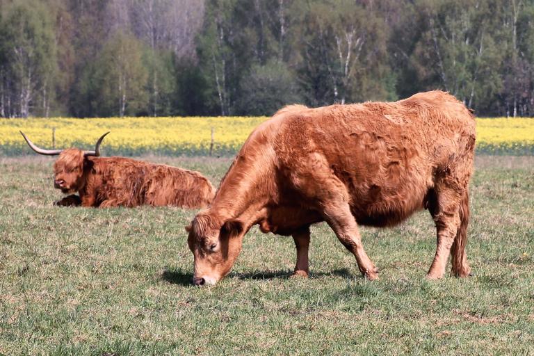 Keywords: cattle cows pasture horns highland beef shaggy graze