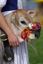 Keywords: cattle show customs appenzellerland appenzell stone calf award floral decorations floral wreath costume young peasant woman girl tradition agriculture switzerland