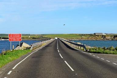 Keywords: causeway sea road sign travel coast nature landscape rock coastal scenic uk scenery water blue green countryside scene blue sky orkney scotland scottish isle bird autumn sunny sky field outdoor car van