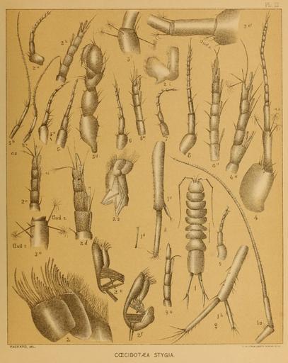| Keywords: Cave Fauna of North America Plate 03.jpg en Plate III Fig 1 Caecidotea stygia Pack Drawn by J S Kingsley from a specimen exactly like one from Mammoth Cave; the details drawn from a Mammoth Cave specimen la larger antenna ; 1b cercopod 2 ; lc cercopod J 1 ; Id one of the terminal setae much larger than the others and bulbous at the end Fig 2a C stygia ” Antennule of short form from the Labyrinth Mammoth Cave ; 26 end of 2a with the three olfac- tory rods; 2c 9 antennule ; ol olfactory rods; 2d the same enlarged showing the four terminal joints filled with nerve cells n cells and the auditory bristle and s ; 2e first maxilla of authors ; 2/ the same enlarged the outer lobe bearing ten or eleven 6imple setae the inner lobe five spinulated setae ; 2g second maxilla of authors ; 2ft end of same enlarged each of the two outer lobes bearing on the inner edge six or seven curious comb like setae not very well represented in the plate the other setae transversely stri- ated; 2i the second pair of appendages behind the mandibles first maxilla Fig 3 3a C stygia Forbes from a well in Illinois ” Second joint of antennule with three auditory bristles ; 3a' three basal joints of antennule from a Mammoth Cave individual with an auditory bristle on the basal and two on the second joint Fig 4 C stygia from Annville Pennsylvania ” Antennule of seventeen joints ” 4a end of the same with six olfactory rods three of which are on the sixth joint from the end Fig 5 C stygia from Long Cave ” Antennule ; 5a antennule of another individual from the same cave with but eight joints; 5b 5c antennae of the same; bd a leg of the first pair 2 adult with eggs Fig 6 C stygia collected in daylight 50 feet in from entrance of Walnut Hill Spring Cave attennule; 6a terminal joints of the same Fig 7 C stygia from Bradford Cave ” Antennule of ten to eleven joints Fig 8 C stygia from Carter X Cave ” 8a terminal joints of the antennule with five olfactory rods Fig 9 C nickajackensis ” Antennule; 9a terminal joints All the figures except one drawn by the author 1888 Packard A S 1888 https //archive org/details/cavefaunaofnorth00pack The cave fauna of North America with remarks on the anatomy of the brain and origin of the blind species Washington National Academy of Sciences Alpheus Spring Packard other versions PD-old-70-1923 The Cave Fauna of North America Uploaded with UploadWizard Caecidotea stygia |