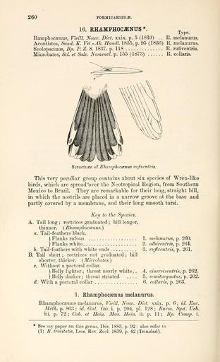 | Keywords: CBBM15 260.png Rhamphocænus rufiventris <small>Bonap </small> Ramphocaenus melanurus rufiventris <small> Bonaparte 1838 </small> en Long-billed Gnatwren bill from lateral underwing showing length of remiges tail from ventral Catalogue of the birds in the British Museum http //www archive org/details/catalogueofbirds15brit Vol 15 Page 260 1890 Philip Lutley Sclater text PD-old CBBM15 Polioptilidae Beaks Bird wings Bird tails | ||||