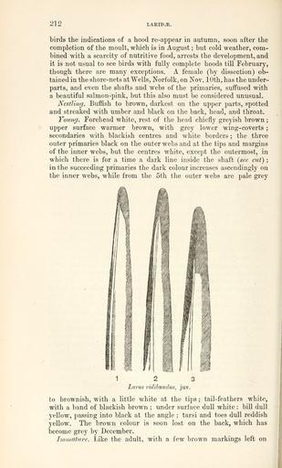 | Keywords: CBBM25 212.png Larus ridibundus <small>L </small> Chroicocephalus ridibundus <small> Linnaeus 1766 </small> juv Common Black-headed Gull juvenile wingtip pattern from below Catalogue of the birds in the British Museum http //www archive org/details/catalogueofbirds25brit Vol 25 Page 212 1896 Howard Saunders Osbert Salvin text PD-old CBBM25 Chroicocephalus ridibundus illustrations Feathers of Chroicocephalus | ||||