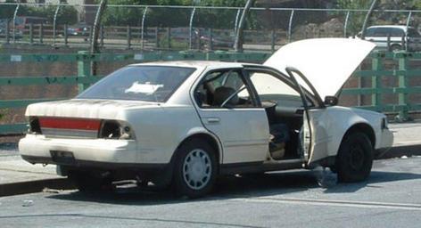 Keywords: Cbxcar.JPG A stripped Nissan Maxima abandoned on some undetermined overpass along the Cross Bronx Expressway 2006-07-29 own assumed Wikiwiki718~commonswiki Cross Bronx Expressway White Nissan sedans Nissan Maxima J30