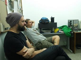 Keywords: Anderson Astor e o Eduardo Alemão Aginer, ao fundo a mesa de luz UV invertida sobre a mesa e ao lado da mochila um tanque de revelação 4x5