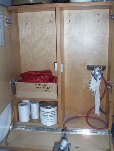 | Keywords: Ceiling balloon cabinet.JPG 2005-08-01 own assumed CambridgeBayWeather A ceiling ballon cabinet At the bottom can be seen the filler stand The hose runs from the filler stand to the needle valve and then to the helium cylinder On the left are stored more balloons string and pibal lights Ceiling balloons |
