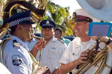 | Keywords: Celebrating in Samoa DVIDS186232.jpg en Chief Petty Officer Brian Chaplow musician a member of the Pacific Fleet Band embarked with Pacific Partnership 2009 practices with members of the Royal Samoan Police Band before marching in a parade honoring National Library Week Pacific Partnership is a humanitarian and civil assistance mission in the Pacific Fleet area of responsibility This year Pacific Partnership will travel to Oceania including Kiribati Republic of the Marshall Islands Samoa Solomon Islands and Tonga The Military Sealift Command dry cargo/ammunition ship USNS Richard E Byrd serves as the enabling platform for Pacific Partnership 2009-07-06 https //www dvidshub net/image/186232 090706-N-+++++-001 2009-07-09 00 02 UPOLU WS PD-USGov-Military-Navy Pacific Partnership 2009 Pacific Fleet Band Images from DoD uploaded by Fæ |