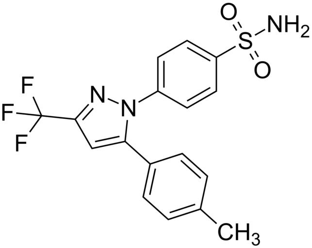 | Keywords: Celecoxib 200.svg validSVG Structure of 4- 5- p-tolyl -3- trifluoromethyl -1H-pyrazol-1-yl benzenesulfonamide Own 2014-04-29 Emeldir <span class signature-talk >talk</span> Chemical structure verified https //upload wikimedia org/wikipedia/commons/6/63/Celecoxib_200 svg 1S/C17H14F3N3O2S/c1-11-2-4-12 5-3-11 15-10-16 17 18 19 20 22-23 15 13-6-8-14 9-7-13 26 21 24 25/h2-10H 1H3 H2 21 24 25 RZEKVGVHFLEQIL-UHFFFAOYSA-N 169590-42-5 Synonyms <small>4- 5- p-Tolyl -3- trifluoromethyl -1H-pyrazol-1-yl benzenesulfonamide 4- 5-p-Tolyl-3-trifluoromethyl-pyrazol-1-yl -benzenesulfonamide 4-5- 4-Methylphenyl -3-trifluorpmethyl -1H-pyrazol-ylbenenesulfonamide 4-5- 4-Methylphenyl -3-trifluorpmethyl -1H-pyrazol-ylbenzenesulfonamide 4-5- 4-Methylphenyl -3- trifluoromethyl -1H-pyrazol-1-yl benzenesulfonamide 4-5- 4-Methylphenyl -3- trifluoromethyl -1H-pyrazol-1-ylbenzenesulfonamide 4-5- 4-methylphenyl -3- trifluoromethyl -1H-pyrazol-1-ylbenzenesulfonamide 4-5- 4-methylphenyl -3- trifluoromethyl pyrazol-1-ylbenzenesulfonamide 4-5- 4-Methylphenyl -3-trifluoromethyl -1H-pyrazol-ylbenzenesulfonamide p-5-p-Tolyl-3- trifluoromethyl pyrazol-1-ylbenzenesulfonamide AI-525 Celebra Celebrex Celecox Celecoxib Celecoxib Celebrex Celecoxibum Celekoxib CJ-016377 CP-598107 HSDB 7038 Niflam Onsenal PF-00345549 PHA-00846533 Research programme injectable celecoxib - Acusphere/Cephalon SC 58635 SC-58635 Selekoksib Selekoksibi YM 177 YM-177 YM177 Zycel</small> PD-chem Celecoxib |